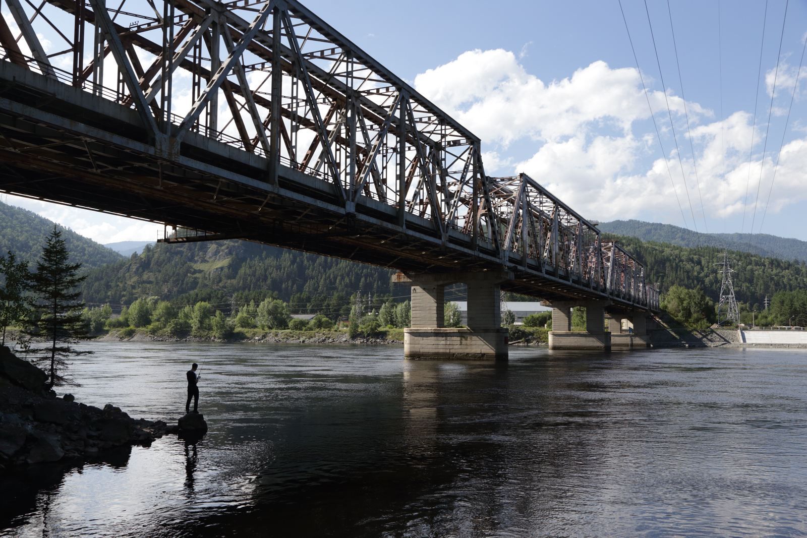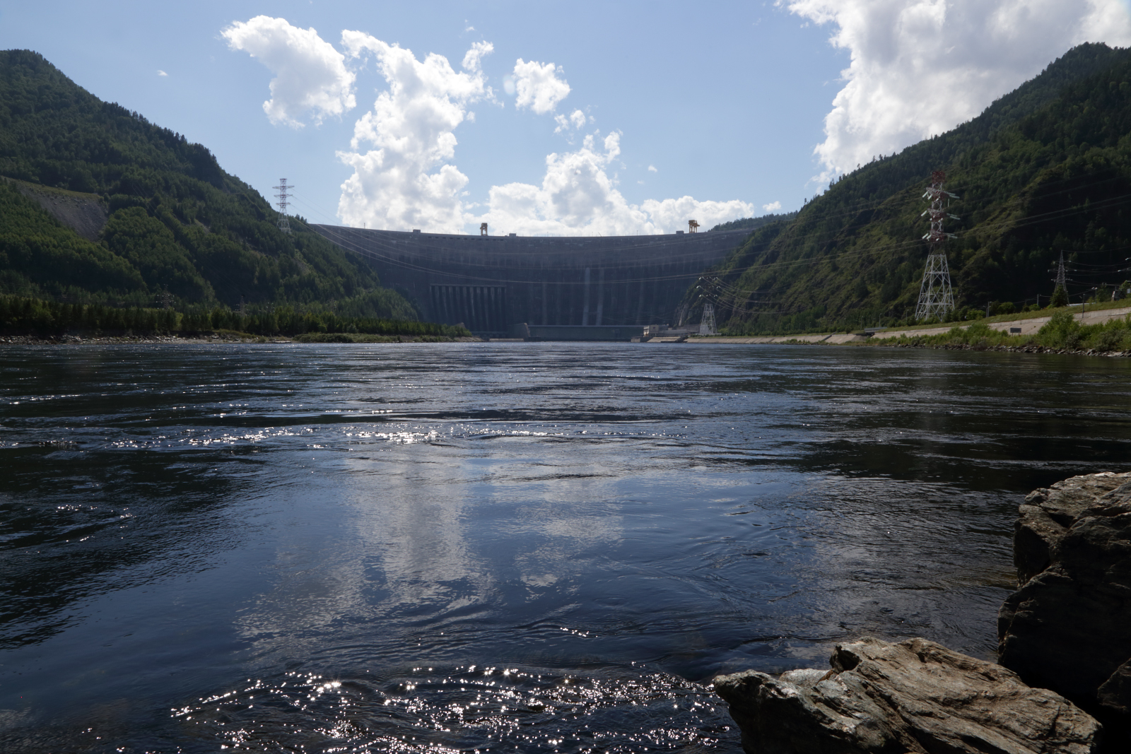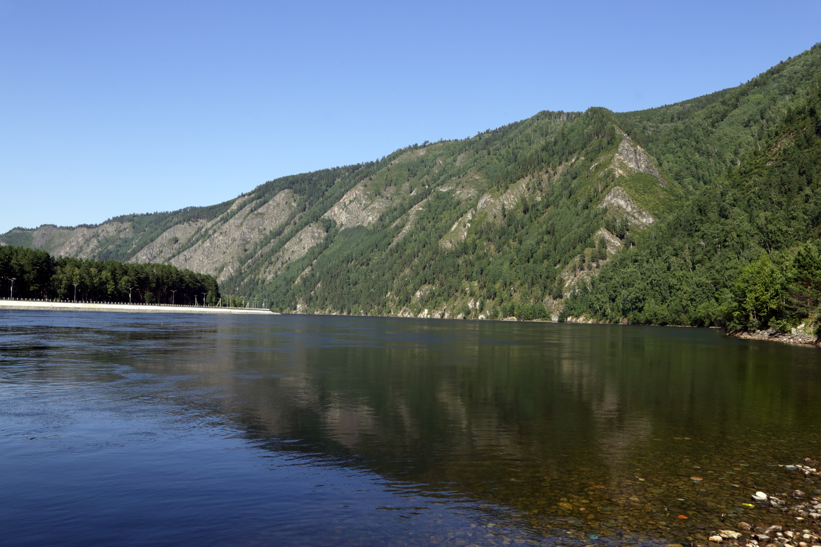 Еду дальше. Миную Саяногорск — чистый, просторный городок. ГЭС всё ближе, теперь дорога начинает петлять вдоль гористого енисейского берега