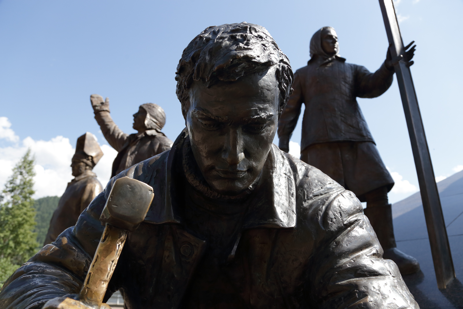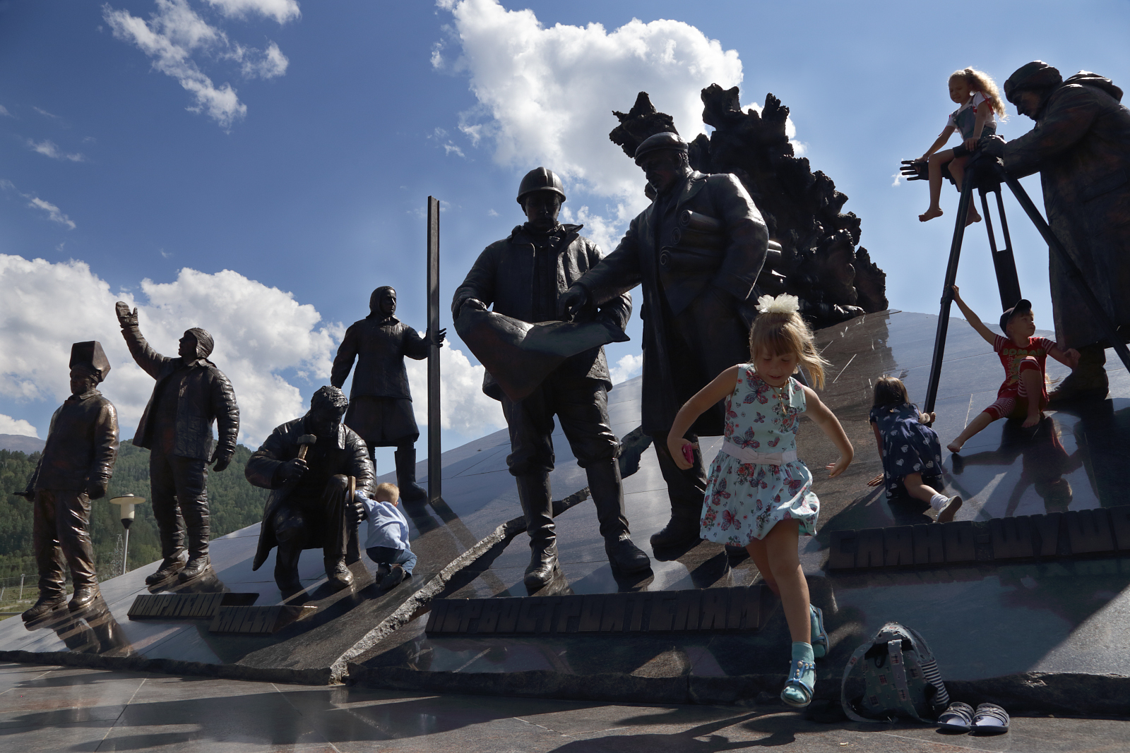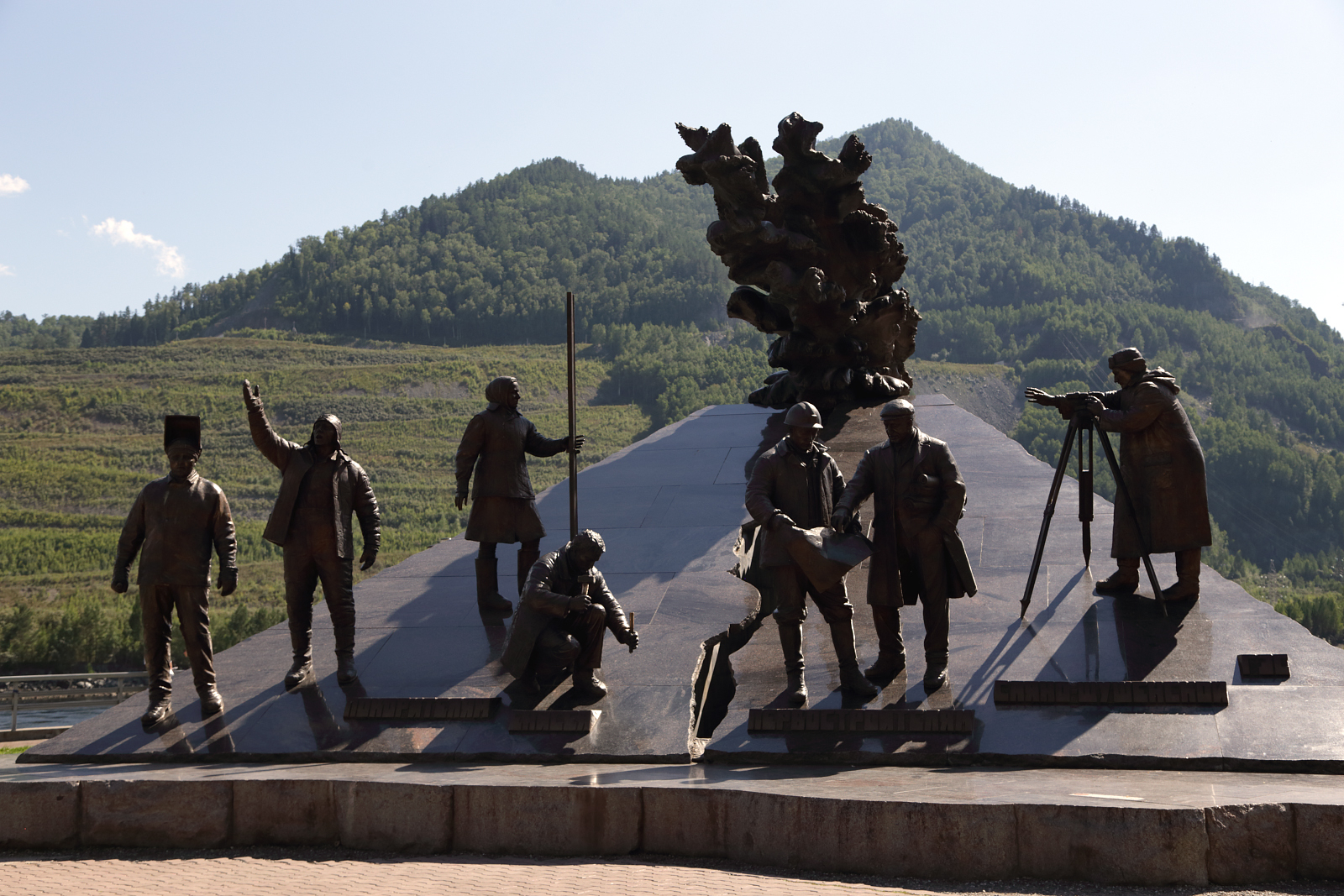 Огромная плотина Саяно-Шушенской (242 м!) стоит вдалеке, где-то там. Но зато памятник строителям удался на славу!