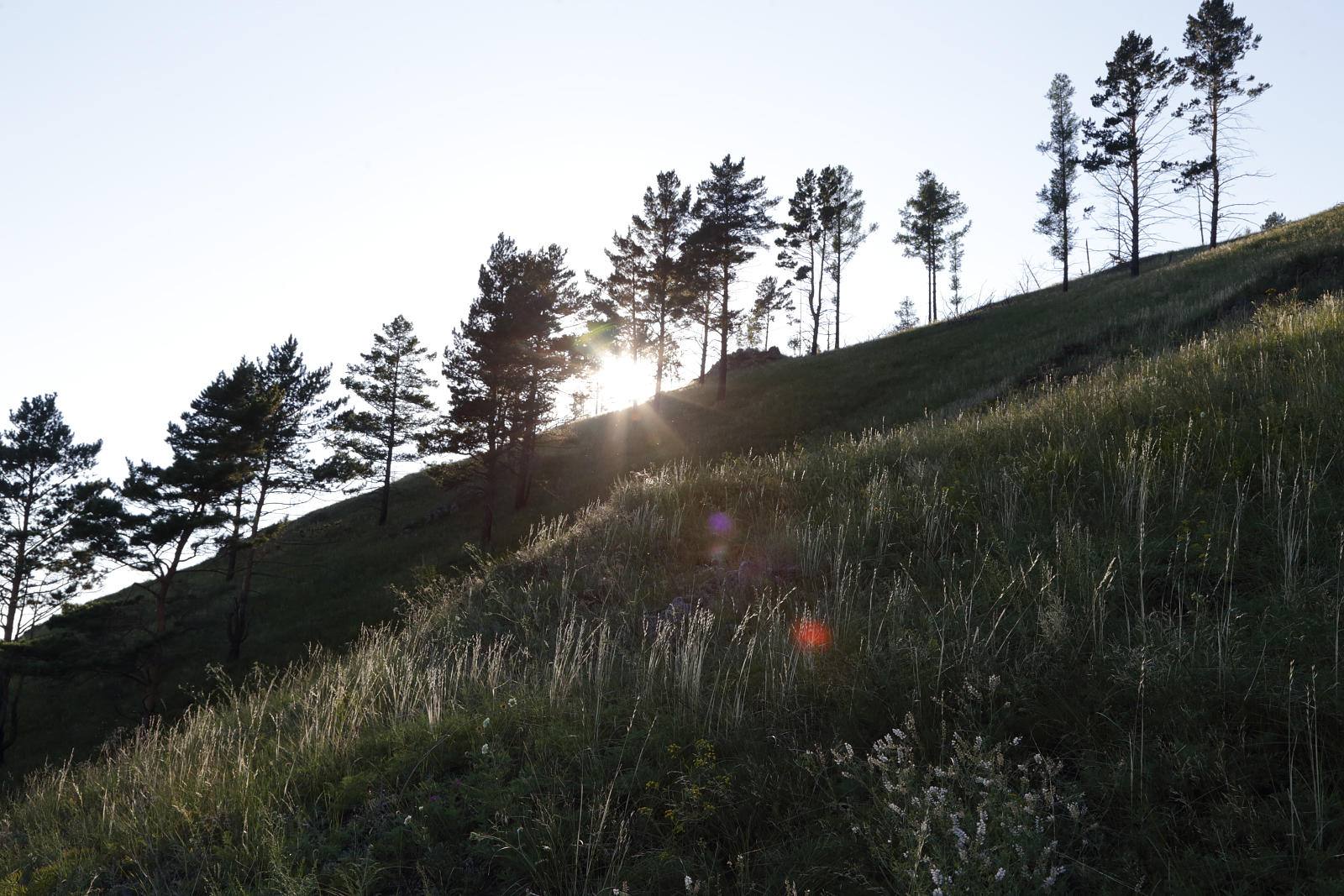 И вот вся эта степь с горами неподалёку величественно, степенно, начинает подниматься к солнцу. Быстро спадает жара, откуда-то появляются комары. Краски начинают меняться с каждой минутой. Ставлю машину на обочине и начинаю ловить кадры. Солнце вправо, я вправо и влево, задним ходом и на первой передаче вперёд метров 200, чтобы поймать нужную композицию. Опытами в целом удовлетворён