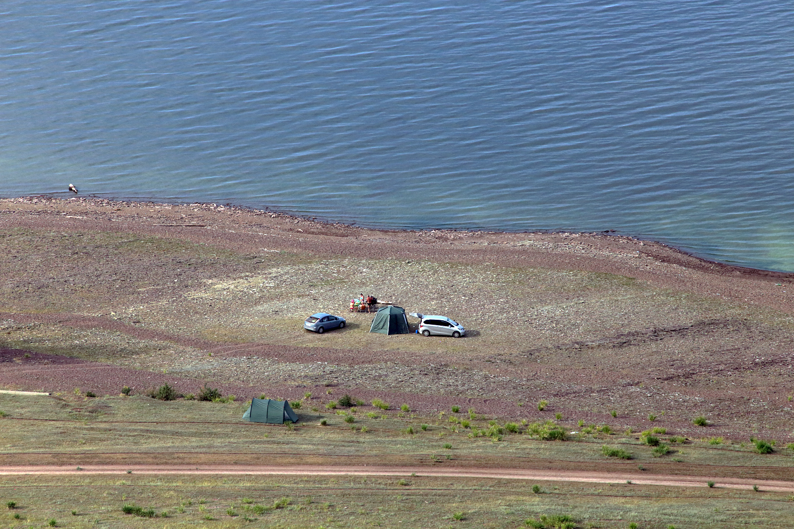 Горка снизу кажется весьма плавной. а на деле местами пришлось цепляться за склоны руками — подъём весьма крутой. В итоге нашёл площадочку метрах в 150-170 над уровнем воды. Внизу, у воды, несколько туристических стоянок. Водичка так себе, уже цветёт, но иногда дети плещутся