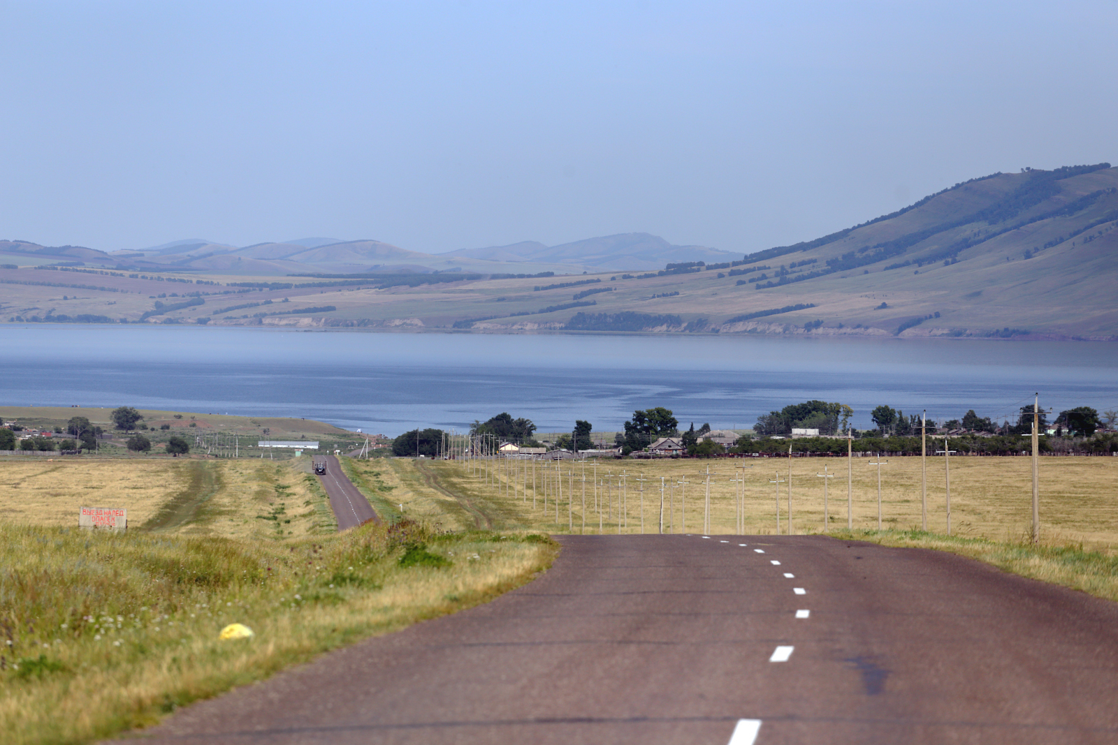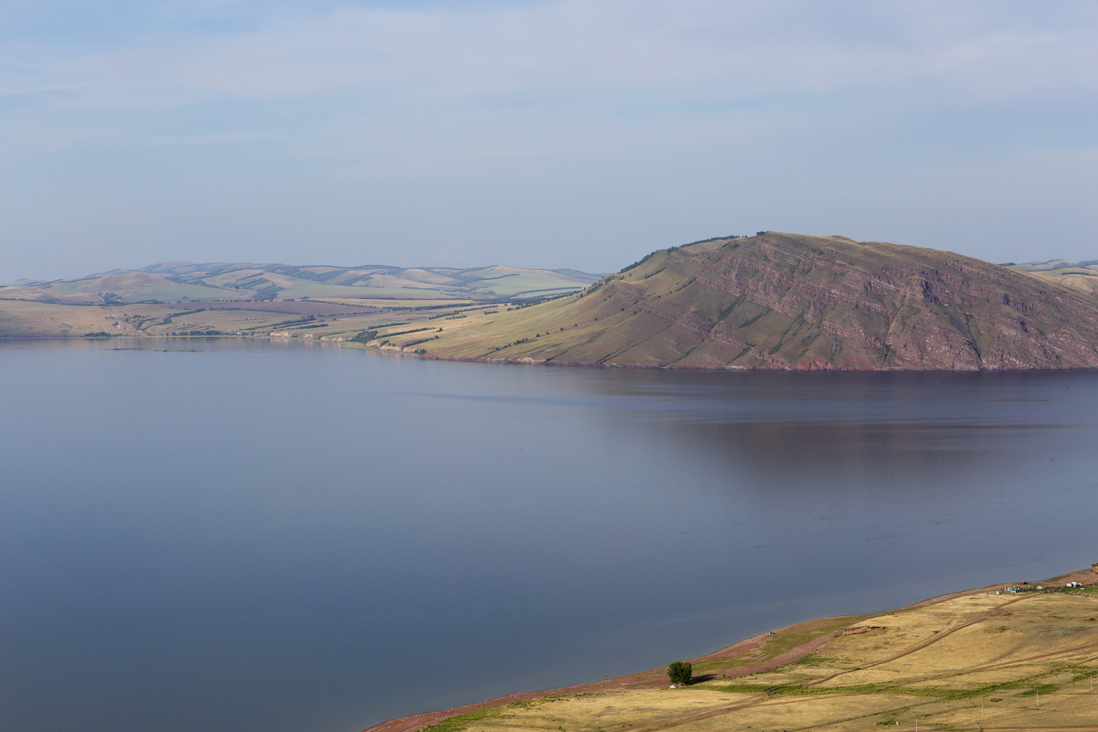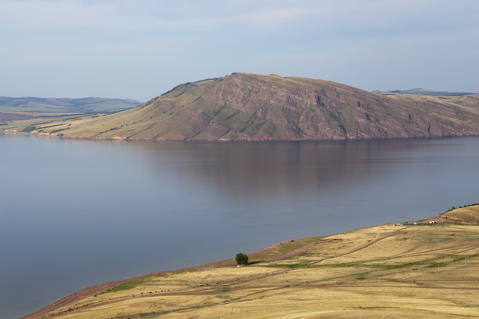 Затарился. Время ещё есть. На карте приметил интересное местечко — село Советская Хакасия. Это километров в 50 севернее Абакана, рядом 200-метровые холмы, с которых должно быть неплохо видно Красноярское водохранилище. Оно, устроенное на Енисее, начинается здесь и вливается непосредственно в тоннели Красноярской ГЭС, в 350 километрах ниже по течению. Поехали!