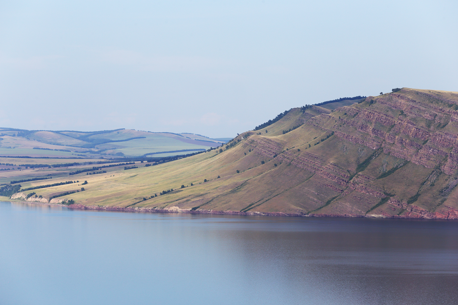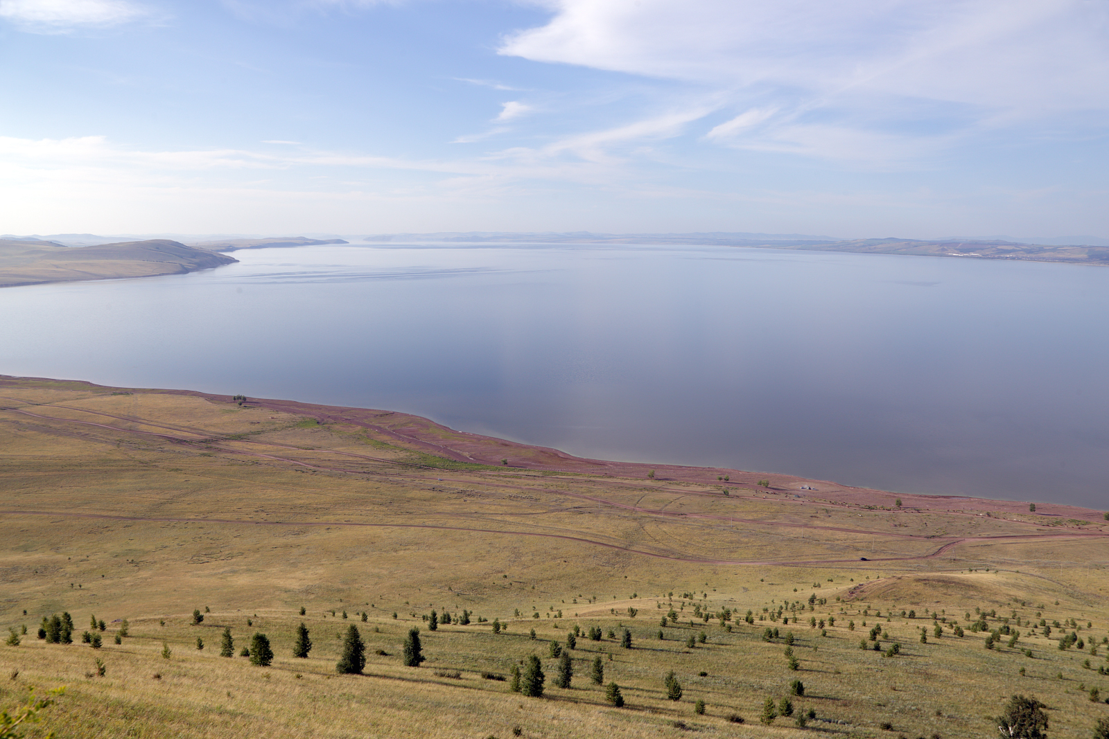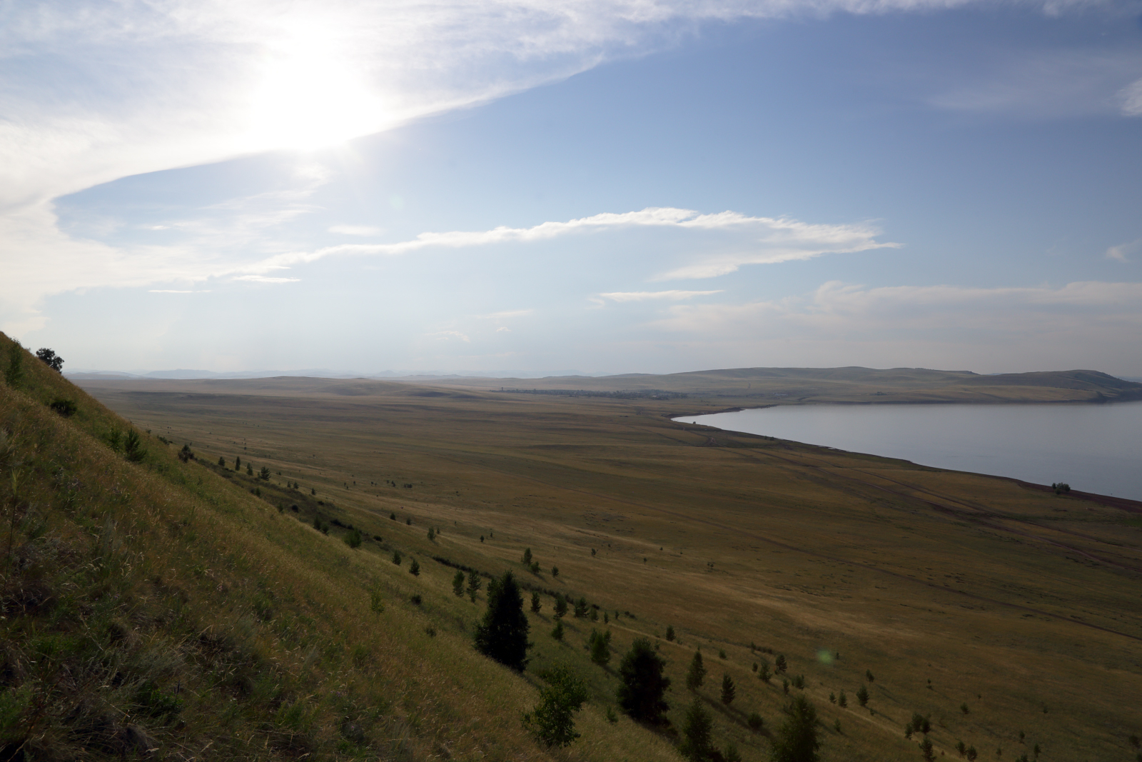 Затарился. Время ещё есть. На карте приметил интересное местечко — село Советская Хакасия. Это километров в 50 севернее Абакана, рядом 200-метровые холмы, с которых должно быть неплохо видно Красноярское водохранилище. Оно, устроенное на Енисее, начинается здесь и вливается непосредственно в тоннели Красноярской ГЭС, в 350 километрах ниже по течению. Поехали!