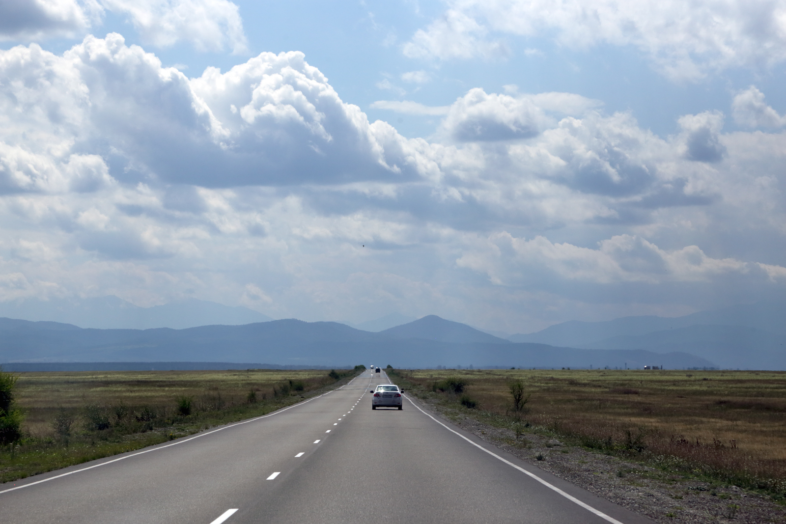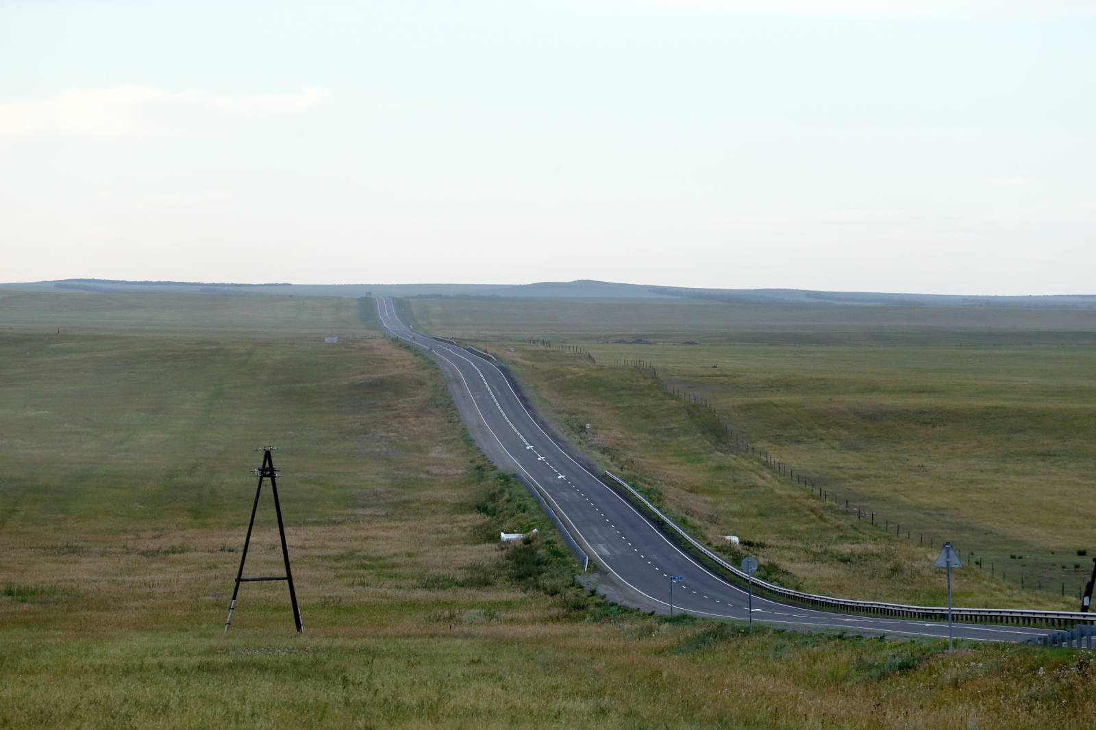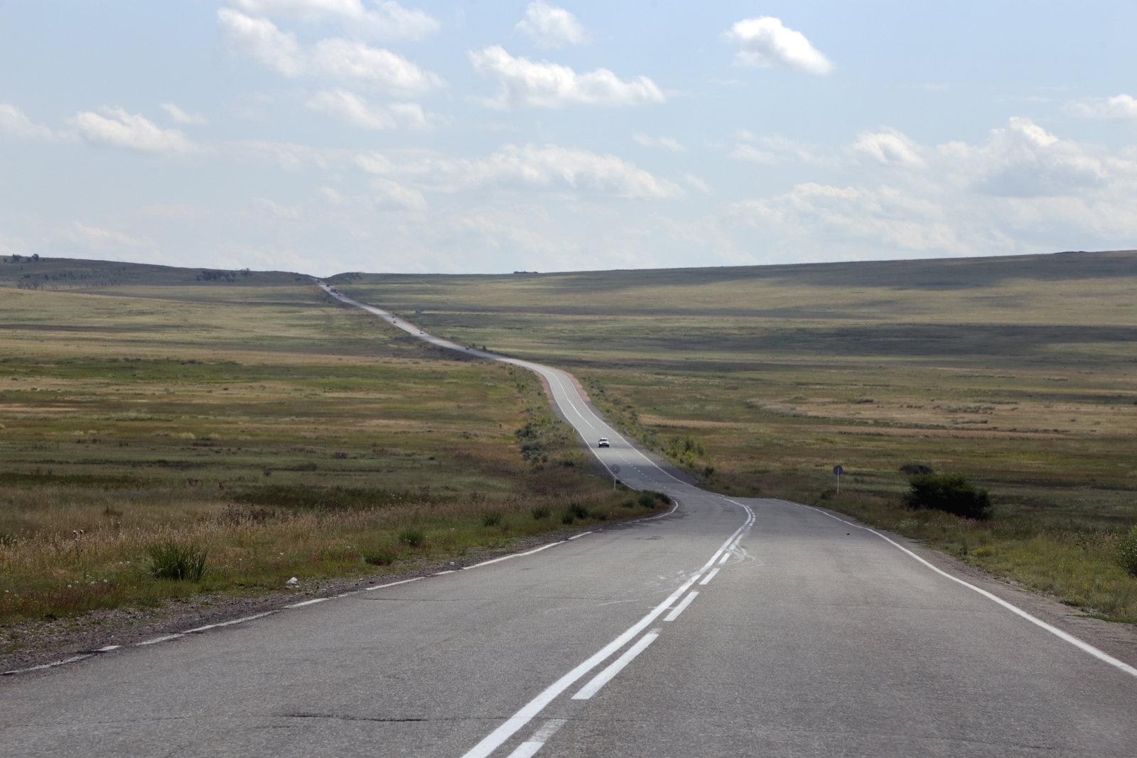 Трасса на Красноярск идёт через бескрайние огромные степи, сложенные в ленивые, перетекающие в друг друга волны гигантского юпитерианского океана. Едешь и поражаешься оттенкам жёлтого, зелёного и синего. Цвета перетекают друг в друга, сиреневые полевые цветы сливаются в пёстрые ручьи. Необычное чувство, как бегал когда-то в детстве по лугу. Теперь летишь на автомобиле и радуешься, как ребёнок. Дорога чистая: нет камер, почти нет попутных и встречных машин. Подумалось ещё, как они тут зимой? Наверное, степные ветры заливают эту двухполосную трассу снегом. Наверное, часто какая-нибудь фура сбивается с пути и улетает с асфальта…