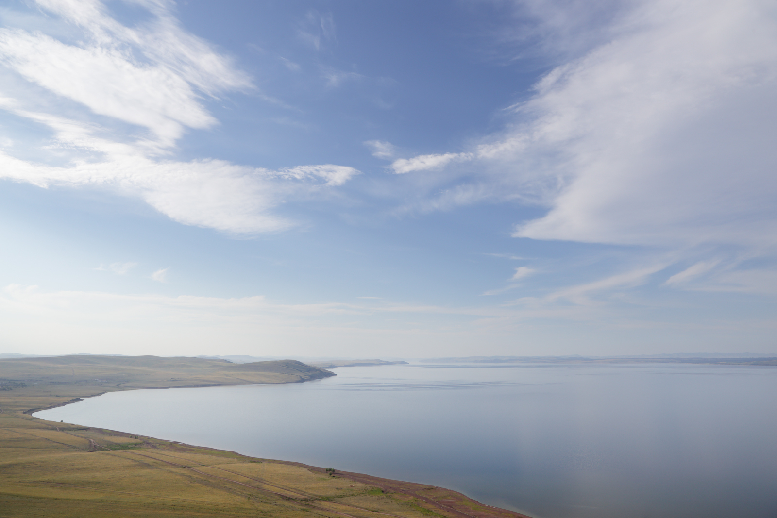 До самого водохранилища и небольшого хребта, который к нему примыкает, надо проехать ещё несколько километров по пыльной грунтовке. Наконец, вот она, возвышенность, и можно стартовать вверх за красивыми кадрами