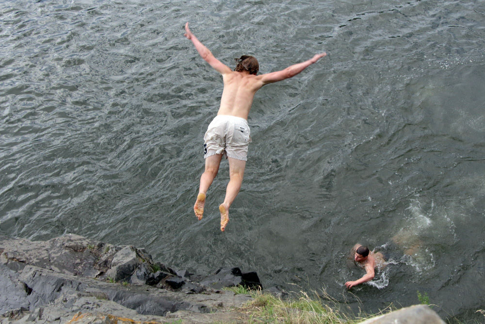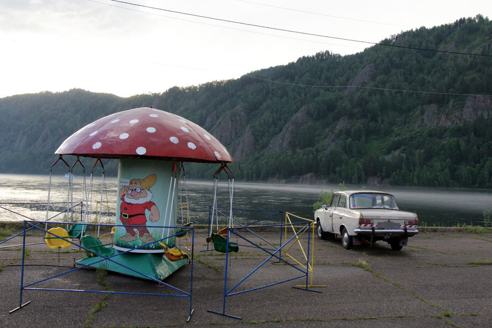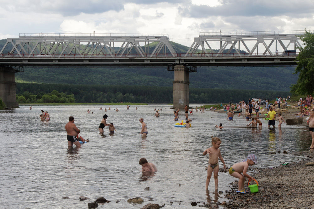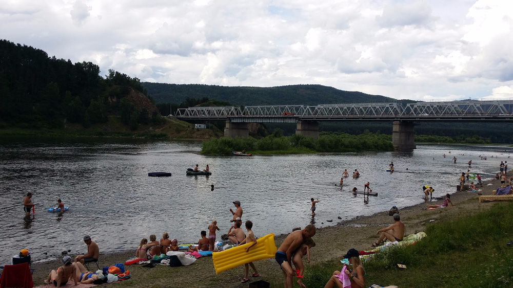 Ближе к Дивногорску есть посёлок Усть-Мана, где река Мана впадает в Енисей. Местные жители, ничуть не смущаясь периодически моросящего дождя, расположились на абсолютно марсианском, каменистом береге, купались в ледяной воде